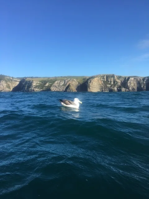 As I got past and aimed at the next point I noticed that my pace was really good today. The tide, wind and swell were making life easy for the start of today. There was, at times, at least a 2.5m swell and I rose and fell over this. It was really well spaced apart and nothing breaking at all, I would just loose sight of the headland and cliffs as it came through. I must have been about an hour into my paddle when I heard a voice shout out to me! That is weird feeling, but I looked up and saw Christine and John in the Interface Kayaks a little further out than me. We both headed towards each other and spent the next couple of hours paddling together. We stopped for morning tea on the water and took pics of the cool Albatross who sat just next to us on the water. Gosh he was stunning, and so big when close.