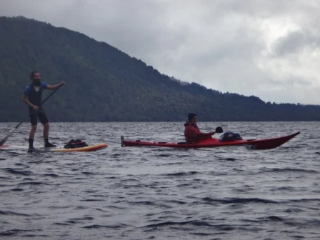 The sight of a sea kayaker and a paddle boarder next to each other on a lake.