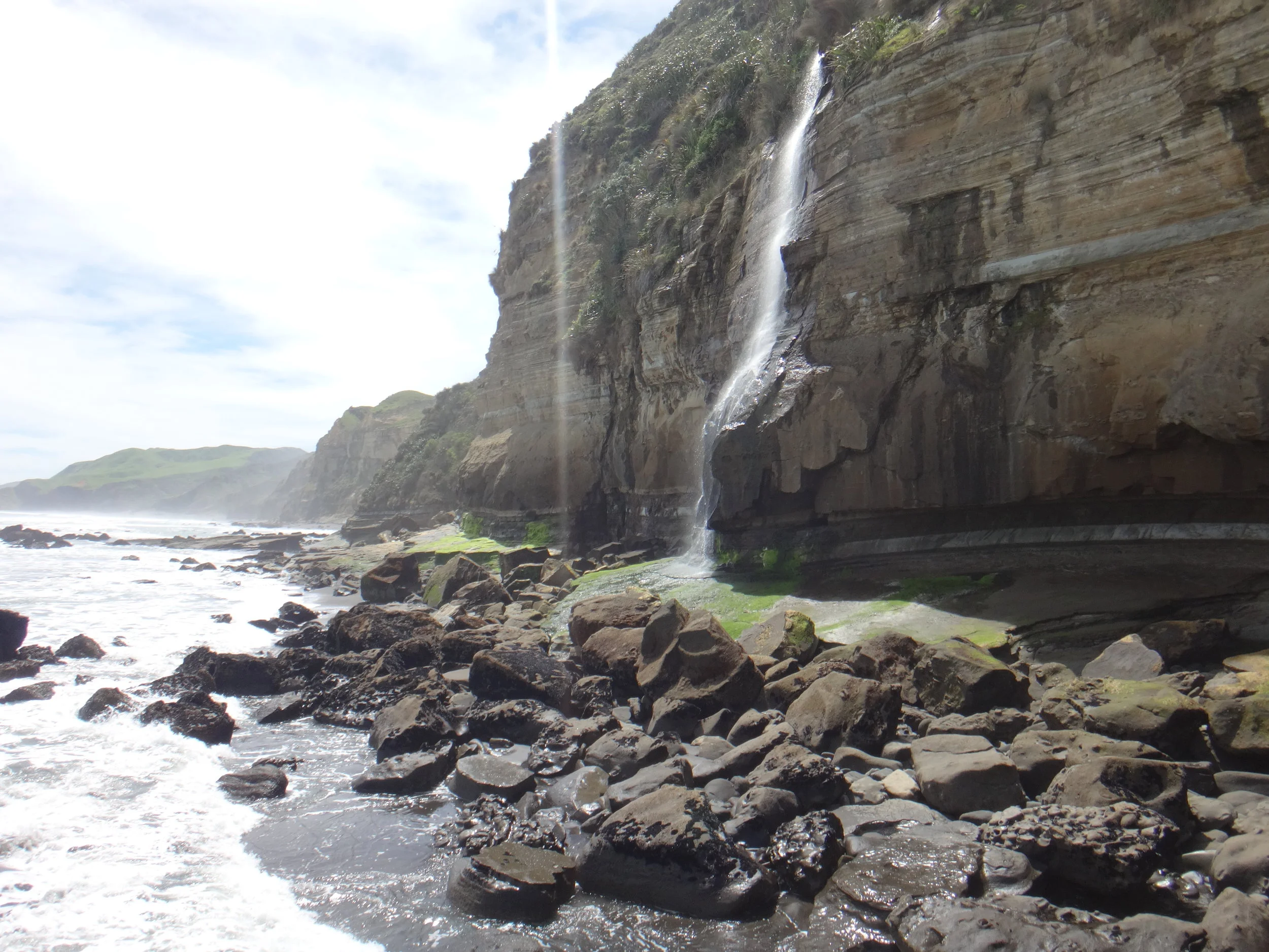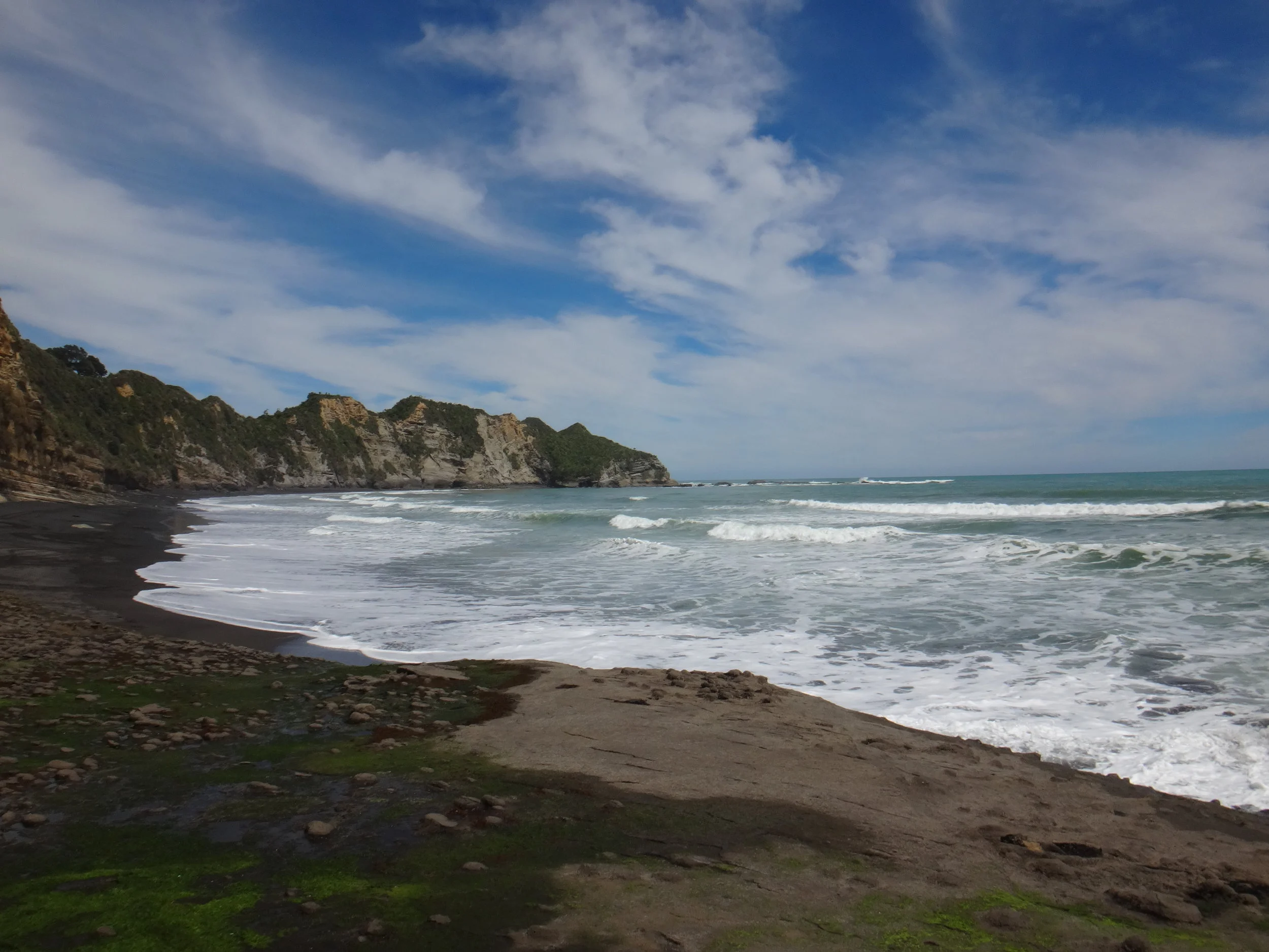 We arrive at the surfers beach, a few surfers were already in the water and black clouds threatened to drench us at any moment as we headed off for our beach hike.At one point we did think seriously of ducking under a large tree further in the sand dunes, but as we climbed further towards shelter and Jase disappeared into the toi-toi that were well above head height, it became obvious to us both it was easier to get wet.